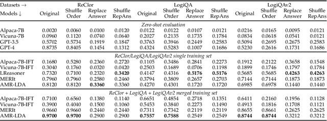Abstract:Large language models (LLMs), such as GPT-3.5 and GPT-4, have greatly advanced the performance of artificial systems on various natural language processing tasks to human-like levels. However, their generalisation and robustness to perform logical reasoning remain under-evaluated. To probe this ability, we propose three new logical reasoning datasets named "ReClor-plus", "LogiQA-plus" and "LogiQAv2-plus", each featuring three subsets: the first with randomly shuffled options, the second with the correct choices replaced by "none of the other options are correct", and a combination of the previous two subsets. We carry out experiments on these datasets with both discriminative and generative LLMs and show that these simple tricks greatly hinder the performance of the language models. Despite their superior performance on the original publicly available datasets, we find that all models struggle to answer our newly constructed datasets. We show that introducing task variations by perturbing a sizable training set can markedly improve the model's generalisation and robustness in logical reasoning tasks. Moreover, applying logic-driven data augmentation for fine-tuning, combined with prompting can enhance the generalisation performance of both discriminative large language models and generative large language models. These results offer insights into assessing and improving the generalisation and robustness of large language models for logical reasoning tasks. We make our source code and data publicly available \url{https://github.com/Strong-AI-Lab/Logical-and-abstract-reasoning}.