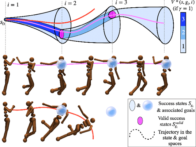Abstract:Deep Reinforcement Learning has been successfully applied to learn robotic control. However, the corresponding algorithms struggle when applied to problems where the agent is only rewarded after achieving a complex task. In this context, using demonstrations can significantly speed up the learning process, but demonstrations can be costly to acquire. In this paper, we propose to leverage a sequential bias to learn control policies for complex robotic tasks using a single demonstration. To do so, our method learns a goal-conditioned policy to control a system between successive low-dimensional goals. This sequential goal-reaching approach raises a problem of compatibility between successive goals: we need to ensure that the state resulting from reaching a goal is compatible with the achievement of the following goals. To tackle this problem, we present a new algorithm called DCIL-II. We show that DCIL-II can solve with unprecedented sample efficiency some challenging simulated tasks such as humanoid locomotion and stand-up as well as fast running with a simulated Cassie robot. Our method leveraging sequentiality is a step towards the resolution of complex robotic tasks under minimal specification effort, a key feature for the next generation of autonomous robots.