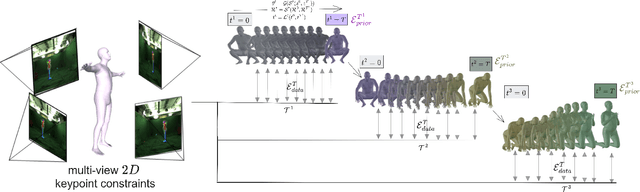 Abstract:Capturing smooth motions from videos using markerless techniques typically involves complex processes such as temporal constraints, multiple stages with data-driven regression and optimization, and bundle solving over temporal windows. These processes can be inefficient and require tuning multiple objectives across stages. In contrast, BundleMoCap introduces a novel and efficient approach to this problem. It solves the motion capture task in a single stage, eliminating the need for temporal smoothness objectives while still delivering smooth motions. BundleMoCap outperforms the state-of-the-art without increasing complexity. The key concept behind BundleMoCap is manifold interpolation between latent keyframes. By relying on a local manifold smoothness assumption, we can efficiently solve a bundle of frames using a single code. Additionally, the method can be implemented as a sliding window optimization and requires only the first frame to be properly initialized, reducing the overall computational burden. BundleMoCap's strength lies in its ability to achieve high-quality motion capture results with simplicity and efficiency. More details can be found at https://moverseai.github.io/bundle/.