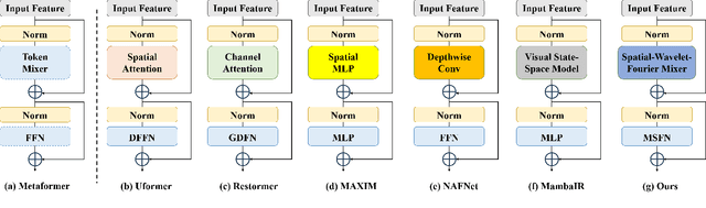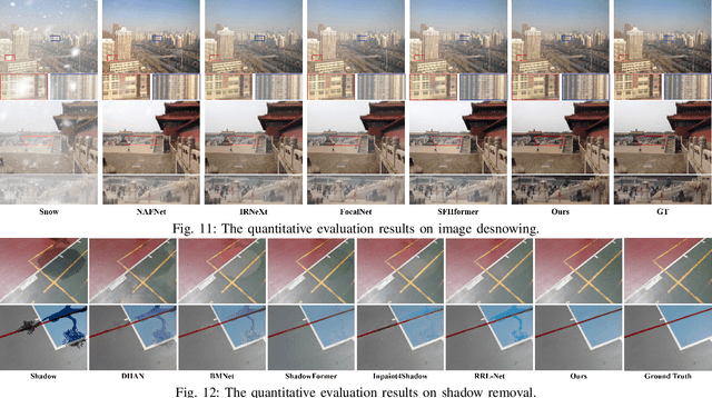 Abstract:Due to adverse atmospheric and imaging conditions, natural images suffer from various degradation phenomena. Consequently, image restoration has emerged as a key solution and garnered substantial attention. Although recent Transformer architectures have demonstrated impressive success across various restoration tasks, their considerable model complexity poses significant challenges for both training and real-time deployment. Furthermore, instead of investigating the commonalities among different degradations, most existing restoration methods focus on modifying Transformer under limited restoration priors. In this work, we first review various degradation phenomena under multi-domain perspective, identifying common priors. Then, we introduce a novel restoration framework, which integrates multi-domain learning into Transformer. Specifically, in Token Mixer, we propose a Spatial-Wavelet-Fourier multi-domain structure that facilitates local-region-global multi-receptive field modeling to replace vanilla self-attention. Additionally, in Feed-Forward Network, we incorporate multi-scale learning to fuse multi-domain features at different resolutions. Comprehensive experimental results across ten restoration tasks, such as dehazing, desnowing, motion deblurring, defocus deblurring, rain streak/raindrop removal, cloud removal, shadow removal, underwater enhancement and low-light enhancement, demonstrate that our proposed model outperforms state-of-the-art methods and achieves a favorable trade-off among restoration performance, parameter size, computational cost and inference latency. The code is available at: https://github.com/deng-ai-lab/SWFormer.