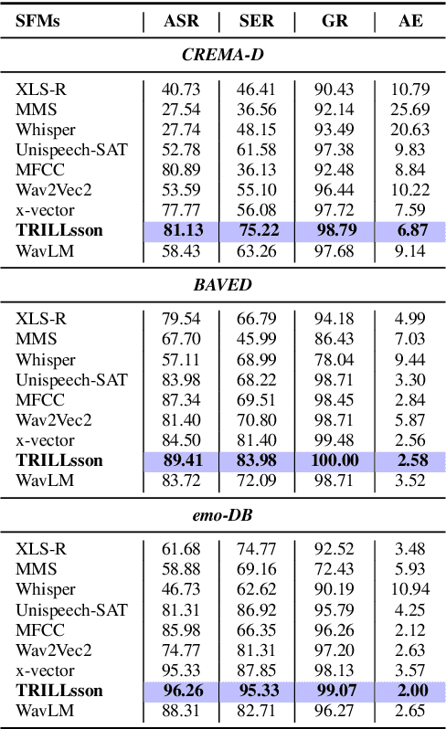 Abstract:Recent benchmarks evaluating pre-trained models (PTMs) for cross-corpus speech emotion recognition (SER) have overlooked PTM pre-trained for paralinguistic speech processing (PSP), raising concerns about their reliability, since SER is inherently a paralinguistic task. We hypothesize that PSP-focused PTM will perform better in cross-corpus SER settings. To test this, we analyze state-of-the-art PTMs representations including paralinguistic, monolingual, multilingual, and speaker recognition. Our results confirm that TRILLsson (a paralinguistic PTM) outperforms others, reinforcing the need to consider PSP-focused PTMs in cross-corpus SER benchmarks. This study enhances benchmark trustworthiness and guides PTMs evaluations for reliable cross-corpus SER.