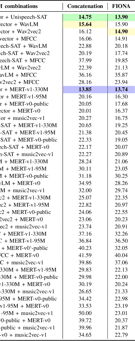 Abstract:In this study, for the first time, we extensively investigate whether music foundation models (MFMs) or speech foundation models (SFMs) work better for singing voice deepfake detection (SVDD), which has recently attracted attention in the research community. For this, we perform a comprehensive comparative study of state-of-the-art (SOTA) MFMs (MERT variants and music2vec) and SFMs (pre-trained for general speech representation learning as well as speaker recognition). We show that speaker recognition SFM representations perform the best amongst all the foundation models (FMs), and this performance can be attributed to its higher efficacy in capturing the pitch, tone, intensity, etc, characteristics present in singing voices. To our end, we also explore the fusion of FMs for exploiting their complementary behavior for improved SVDD, and we propose a novel framework, FIONA for the same. With FIONA, through the synchronization of x-vector (speaker recognition SFM) and MERT-v1-330M (MFM), we report the best performance with the lowest Equal Error Rate (EER) of 13.74 %, beating all the individual FMs as well as baseline FM fusions and achieving SOTA results.