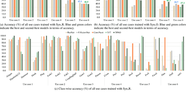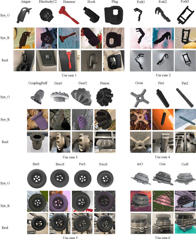 Abstract:This paper addresses key aspects of domain randomization in generating synthetic data for manufacturing object detection applications. To this end, we present a comprehensive data generation pipeline that reflects different factors: object characteristics, background, illumination, camera settings, and post-processing. We also introduce the Synthetic Industrial Parts Object Detection dataset (SIP15-OD) consisting of 15 objects from three industrial use cases under varying environments as a test bed for the study, while also employing an industrial dataset publicly available for robotic applications. In our experiments, we present more abundant results and insights into the feasibility as well as challenges of sim-to-real object detection. In particular, we identified material properties, rendering methods, post-processing, and distractors as important factors. Our method, leveraging these, achieves top performance on the public dataset with Yolov8 models trained exclusively on synthetic data; mAP@50 scores of 96.4% for the robotics dataset, and 94.1%, 99.5%, and 95.3% across three of the SIP15-OD use cases, respectively. The results showcase the effectiveness of the proposed domain randomization, potentially covering the distribution close to real data for the applications.