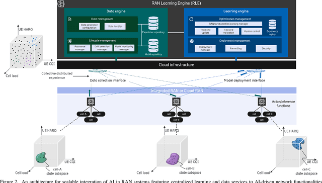 Abstract:Artificial intelligence (AI) has emerged as a powerful tool for addressing complex and dynamic tasks in communication systems, where traditional rule-based algorithms often struggle. However, most AI applications to networking tasks are designed and trained for specific, limited conditions, hindering the algorithms from learning and adapting to generic situations, such as those met across radio access networks (RAN). This paper proposes design principles for sustainable and scalable AI integration in communication systems, focusing on creating AI algorithms that can generalize across network environments, intents, and control tasks. This approach enables a limited number of AI-driven RAN functions to tackle larger problems, improve system performance, and simplify lifecycle management. To achieve sustainability and automation, we introduce a scalable learning architecture that supports all deployed AI applications in the system. This architecture separates centralized learning functionalities from distributed actuation and inference functions, enabling efficient data collection and management, computational and storage resources optimization, and cost reduction. We illustrate these concepts by designing a generalized link adaptation algorithm, demonstrating the benefits of our proposed approach.
