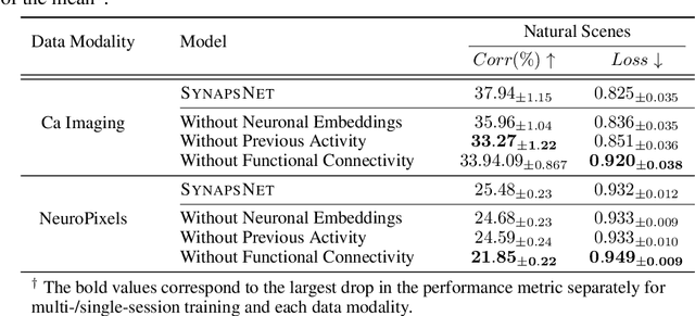 Abstract:The availability of large-scale neuronal population datasets necessitates new methods to model population dynamics and extract interpretable, scientifically translatable insights. Existing deep learning methods often overlook the biological mechanisms underlying population activity and thus exhibit suboptimal performance with neuronal data and provide little to no interpretable information about neurons and their interactions. In response, we introduce SynapsNet, a novel deep-learning framework that effectively models population dynamics and functional interactions between neurons. Within this biologically realistic framework, each neuron, characterized by a latent embedding, sends and receives currents through directed connections. A shared decoder uses the input current, previous neuronal activity, neuron embedding, and behavioral data to predict the population activity in the next time step. Unlike common sequential models that treat population activity as a multichannel time series, SynapsNet applies its decoder to each neuron (channel) individually, with the learnable functional connectivity serving as the sole pathway for information flow between neurons. Our experiments, conducted on mouse cortical activity from publicly available datasets and recorded using the two most common population recording modalities (Ca imaging and Neuropixels) across three distinct tasks, demonstrate that SynapsNet consistently outperforms existing models in forecasting population activity. Additionally, our experiments on both real and synthetic data showed that SynapsNet accurately learns functional connectivity that reveals predictive interactions between neurons.