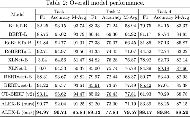 Abstract:As social media becomes increasingly popular, more and more public health activities emerge, which is worth noting for pandemic monitoring and government decision-making. Current techniques for public health analysis involve popular models such as BERT and large language models (LLMs). Although recent progress in LLMs has shown a strong ability to comprehend knowledge by being fine-tuned on specific domain datasets, the costs of training an in-domain LLM for every specific public health task are especially expensive. Furthermore, such kinds of in-domain datasets from social media are generally highly imbalanced, which will hinder the efficiency of LLMs tuning. To tackle these challenges, the data imbalance issue can be overcome by sophisticated data augmentation methods for social media datasets. In addition, the ability of the LLMs can be effectively utilised by prompting the model properly. In light of the above discussion, in this paper, a novel ALEX framework is proposed for social media analysis on public health. Specifically, an augmentation pipeline is developed to resolve the data imbalance issue. Furthermore, an LLMs explanation mechanism is proposed by prompting an LLM with the predicted results from BERT models. Extensive experiments conducted on three tasks at the Social Media Mining for Health 2023 (SMM4H) competition with the first ranking in two tasks demonstrate the superior performance of the proposed ALEX method. Our code has been released in https://github.com/YanJiangJerry/ALEX.
