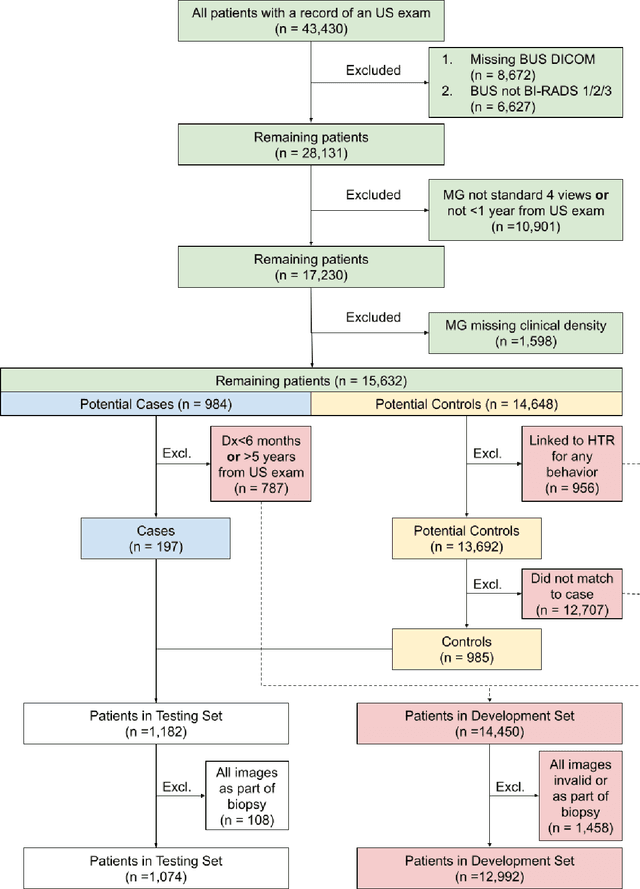 Abstract:Background: Mammographic breast density, as defined by the American College of Radiology's Breast Imaging Reporting and Data System (BI-RADS), is one of the strongest risk factors for breast cancer, but is derived from mammographic images. Breast ultrasound (BUS) is an alternative breast cancer screening modality, particularly useful for early detection in low-resource, rural contexts. The purpose of this study was to explore an artificial intelligence (AI) model to predict BI-RADS mammographic breast density category from clinical, handheld BUS imaging. Methods: All data are sourced from the Hawaii and Pacific Islands Mammography Registry. We compared deep learning methods from BUS imaging, as well as machine learning models from image statistics alone. The use of AI-derived BUS density as a risk factor for breast cancer was then compared to clinical BI-RADS breast density while adjusting for age. The BUS data were split by individual into 70/20/10% groups for training, validation, and testing. Results: 405,120 clinical BUS images from 14.066 women were selected for inclusion in this study, resulting in 9.846 women for training (302,574 images), 2,813 for validation (11,223 images), and 1,406 for testing (4,042 images). On the held-out testing set, the strongest AI model achieves AUROC 0.854 predicting BI-RADS mammographic breast density from BUS imaging and outperforms all shallow machine learning methods based on image statistics. In cancer risk prediction, age-adjusted AI BUS breast density predicted 5-year breast cancer risk with 0.633 AUROC, as compared to 0.637 AUROC from age-adjusted clinical breast density. Conclusions: BI-RADS mammographic breast density can be estimated from BUS imaging with high accuracy using a deep learning model. Furthermore, we demonstrate that AI-derived BUS breast density is predictive of 5-year breast cancer risk in our population.