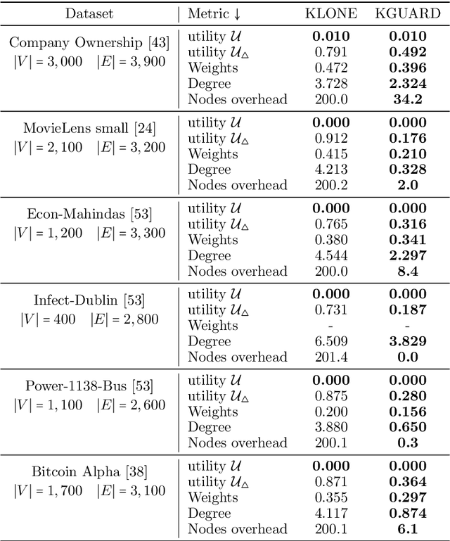 Abstract:Knowledge Graphs (KGs) have recently gained relevant attention in many application domains, from healthcare to biotechnology, from logistics to finance. Financial organisations, central banks, economic research entities, and national supervision authorities apply ontological reasoning on KGs to address crucial business tasks, such as economic policymaking, banking supervision, anti-money laundering, and economic research. Reasoning allows for the generation of derived knowledge capturing complex business semantics and the set up of effective business processes. A major obstacle in KGs sharing is represented by privacy considerations since the identity of the data subjects and their sensitive or company-confidential information may be improperly exposed. In this paper, we propose a novel framework to enable KGs sharing while ensuring that information that should remain private is not directly released nor indirectly exposed via derived knowledge, while maintaining the embedded knowledge of the KGs to support business downstream tasks. Our approach produces a privacy-preserving synthetic KG as an augmentation of the input one via the introduction of structural anonymisation. We introduce a novel privacy measure for KGs, which considers derived knowledge and a new utility metric that captures the business semantics we want to preserve, and propose two novel anonymization algorithms. Our extensive experimental evaluation, with both synthetic graphs and real-world datasets, confirms the effectiveness of our approach achieving up to a 70% improvement in the privacy of entities compared to existing methods not specifically designed for KGs.