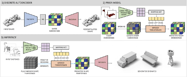 Abstract:Significant progress has recently been made in creative applications of large pre-trained models for downstream tasks in 3D vision, such as text-to-shape generation. This motivates our investigation of how these pre-trained models can be used effectively to generate 3D shapes from sketches, which has largely remained an open challenge due to the limited sketch-shape paired datasets and the varying level of abstraction in the sketches. We discover that conditioning a 3D generative model on the features (obtained from a frozen large pre-trained vision model) of synthetic renderings during training enables us to effectively generate 3D shapes from sketches at inference time. This suggests that the large pre-trained vision model features carry semantic signals that are resilient to domain shifts, i.e., allowing us to use only RGB renderings, but generalizing to sketches at inference time. We conduct a comprehensive set of experiments investigating different design factors and demonstrate the effectiveness of our straightforward approach for generation of multiple 3D shapes per each input sketch regardless of their level of abstraction without requiring any paired datasets during training.