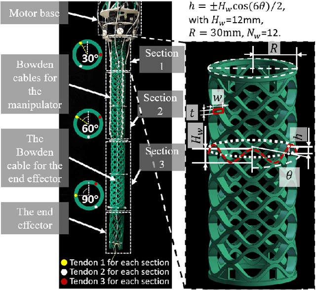 Abstract:Modular soft robot arms (MSRAs) are composed of multiple independent modules connected in a sequence. Due to their modular structure and high degrees of freedom (DOFs), these modules can simultaneously bend at different angles in various directions, enabling complex deformation. This capability allows MSRAs to perform more intricate tasks than single module robots. However, the modular structure also induces challenges in accurate planning, modeling, and control. Nonlinearity, hysteresis, and gravity complicate the physical model, while the modular structure and increased DOFs further lead to accumulative errors along the sequence. To address these challenges, we propose a flexible task space planning and control strategy for MSRAs, named S2C2A (State to Configuration to Action). Our approach formulates an optimization problem, S2C (State to Configuration planning), which integrates various loss functions and a forward MSRA model to generate configuration trajectories based on target MSRA states. Given the model complexity, we leverage a biLSTM network as the forward model. Subsequently, a configuration controller C2A (Configuration to Action control) is implemented to follow the planned configuration trajectories, leveraging only inaccurate internal sensing feedback. Both a biLSTM network and a physical model are utilized for configuration control. We validated our strategy using a cable-driven MSRA, demonstrating its ability to perform diverse offline tasks such as position control, orientation control, and obstacle avoidance. Furthermore, our strategy endows MSRA with online interaction capability with targets and obstacles. Future work will focus on addressing MSRA challenges, such as developing more accurate physical models and reducing configuration estimation errors along the module sequence.