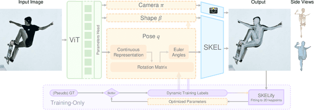 Abstract:In this paper, we introduce a method for reconstructing 3D humans from a single image using a biomechanically accurate skeleton model. To achieve this, we train a transformer that takes an image as input and estimates the parameters of the model. Due to the lack of training data for this task, we build a pipeline to produce pseudo ground truth model parameters for single images and implement a training procedure that iteratively refines these pseudo labels. Compared to state-of-the-art methods for 3D human mesh recovery, our model achieves competitive performance on standard benchmarks, while it significantly outperforms them in settings with extreme 3D poses and viewpoints. Additionally, we show that previous reconstruction methods frequently violate joint angle limits, leading to unnatural rotations. In contrast, our approach leverages the biomechanically plausible degrees of freedom making more realistic joint rotation estimates. We validate our approach across multiple human pose estimation benchmarks. We make the code, models and data available at: https://isshikihugh.github.io/HSMR/