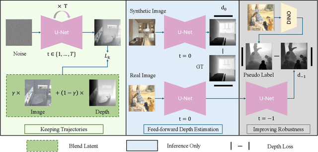 Abstract:Monocular Depth Estimation (MDE) is essential for applications like 3D scene reconstruction, autonomous navigation, and AI content creation. However, robust MDE remains challenging due to noisy real-world data and distribution gaps in synthetic datasets. Existing methods often struggle with low efficiency, reduced accuracy, and lack of detail. To address this, we propose an efficient approach for leveraging diffusion priors and introduce FiffDepth, a framework that transforms diffusion-based image generators into a feedforward architecture for detailed depth estimation. By preserving key generative features and integrating the strong generalization capabilities of models like dinov2, FiffDepth achieves enhanced accuracy, stability, and fine-grained detail, offering a significant improvement in MDE performance across diverse real-world scenarios.