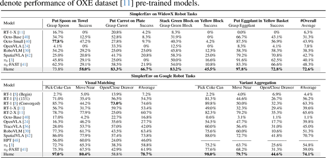 Abstract:Humans practice slow thinking before performing actual actions when handling complex tasks in the physical world. This thinking paradigm, recently, has achieved remarkable advancement in boosting Large Language Models (LLMs) to solve complex tasks in digital domains. However, the potential of slow thinking remains largely unexplored for robotic foundation models interacting with the physical world. In this work, we propose Hume: a dual-system Vision-Language-Action (VLA) model with value-guided System-2 thinking and cascaded action denoising, exploring human-like thinking capabilities of Vision-Language-Action models for dexterous robot control. System 2 of Hume implements value-Guided thinking by extending a Vision-Language-Action Model backbone with a novel value-query head to estimate the state-action value of predicted actions. The value-guided thinking is conducted by repeat sampling multiple action candidates and selecting one according to state-action value. System 1 of Hume is a lightweight reactive visuomotor policy that takes System 2 selected action and performs cascaded action denoising for dexterous robot control. At deployment time, System 2 performs value-guided thinking at a low frequency while System 1 asynchronously receives the System 2 selected action candidate and predicts fluid actions in real time. We show that Hume outperforms the existing state-of-the-art Vision-Language-Action models across multiple simulation benchmark and real-robot deployments.