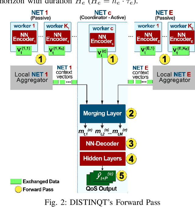 Abstract:Beyond 5G and 6G networks are expected to support new and challenging use cases and applications that depend on a certain level of Quality of Service (QoS) to operate smoothly. Predicting the QoS in a timely manner is of high importance, especially for safety-critical applications as in the case of vehicular communications. Although until recent years the QoS prediction has been carried out by centralized Artificial Intelligence (AI) solutions, a number of privacy, computational, and operational concerns have emerged. Alternative solutions have been surfaced (e.g. Split Learning, Federated Learning), distributing AI tasks of reduced complexity across nodes, while preserving the privacy of the data. However, new challenges rise when it comes to scalable distributed learning approaches, taking into account the heterogeneous nature of future wireless networks. The current work proposes DISTINQT, a privacy-aware distributed learning framework for QoS prediction. Our framework supports multiple heterogeneous nodes, in terms of data types and model architectures, by sharing computations across them. This, enables the incorporation of diverse knowledge into a sole learning process that will enhance the robustness and generalization capabilities of the final QoS prediction model. DISTINQT also contributes to data privacy preservation by encoding any raw input data into a non-linear latent representation before any transmission. Evaluation results showcase that our framework achieves a statistically identical performance compared to its centralized version and an average performance improvement of up to 65% against six state-of-the-art centralized baseline solutions in the Tele-Operated Driving use case.