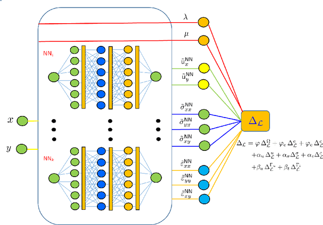 Abstract:The paper presents an efficient and robust data-driven deep learning (DL) computational framework developed for linear continuum elasticity problems. The methodology is based on the fundamentals of the Physics Informed Neural Networks (PINNs). For an accurate representation of the field variables, a multi-objective loss function is proposed. It consists of terms corresponding to the residual of the governing partial differential equations (PDE), constitutive relations derived from the governing physics, various boundary conditions, and data-driven physical knowledge fitting terms across randomly selected collocation points in the problem domain. To this end, multiple densely connected independent artificial neural networks (ANNs), each approximating a field variable, are trained to obtain accurate solutions. Several benchmark problems including the Airy solution to elasticity and the Kirchhoff-Love plate problem are solved. Performance in terms of accuracy and robustness illustrates the superiority of the current framework showing excellent agreement with analytical solutions. The present work combines the benefits of the classical methods depending on the physical information available in analytical relations with the superior capabilities of the DL techniques in the data-driven construction of lightweight, yet accurate and robust neural networks. The models developed herein can significantly boost computational speed using minimal network parameters with easy adaptability in different computational platforms.