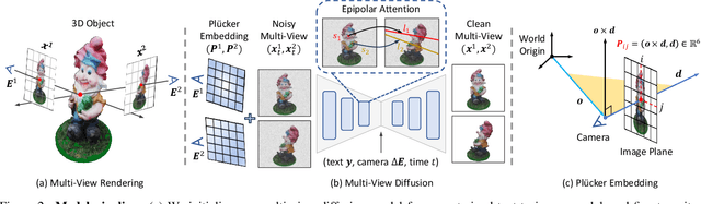 Abstract:We present SPAD, a novel approach for creating consistent multi-view images from text prompts or single images. To enable multi-view generation, we repurpose a pretrained 2D diffusion model by extending its self-attention layers with cross-view interactions, and fine-tune it on a high quality subset of Objaverse. We find that a naive extension of the self-attention proposed in prior work (e.g. MVDream) leads to content copying between views. Therefore, we explicitly constrain the cross-view attention based on epipolar geometry. To further enhance 3D consistency, we utilize Plucker coordinates derived from camera rays and inject them as positional encoding. This enables SPAD to reason over spatial proximity in 3D well. In contrast to recent works that can only generate views at fixed azimuth and elevation, SPAD offers full camera control and achieves state-of-the-art results in novel view synthesis on unseen objects from the Objaverse and Google Scanned Objects datasets. Finally, we demonstrate that text-to-3D generation using SPAD prevents the multi-face Janus issue. See more details at our webpage: https://yashkant.github.io/spad