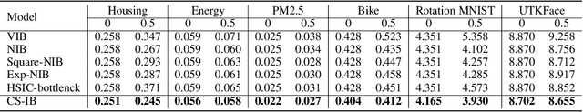 Abstract:The information bottleneck (IB) approach is popular to improve the generalization, robustness and explainability of deep neural networks. Essentially, it aims to find a minimum sufficient representation $\mathbf{t}$ by striking a trade-off between a compression term $I(\mathbf{x};\mathbf{t})$ and a prediction term $I(y;\mathbf{t})$, where $I(\cdot;\cdot)$ refers to the mutual information (MI). MI is for the IB for the most part expressed in terms of the Kullback-Leibler (KL) divergence, which in the regression case corresponds to prediction based on mean squared error (MSE) loss with Gaussian assumption and compression approximated by variational inference. In this paper, we study the IB principle for the regression problem and develop a new way to parameterize the IB with deep neural networks by exploiting favorable properties of the Cauchy-Schwarz (CS) divergence. By doing so, we move away from MSE-based regression and ease estimation by avoiding variational approximations or distributional assumptions. We investigate the improved generalization ability of our proposed CS-IB and demonstrate strong adversarial robustness guarantees. We demonstrate its superior performance on six real-world regression tasks over other popular deep IB approaches. We additionally observe that the solutions discovered by CS-IB always achieve the best trade-off between prediction accuracy and compression ratio in the information plane. The code is available at \url{https://github.com/SJYuCNEL/Cauchy-Schwarz-Information-Bottleneck}.