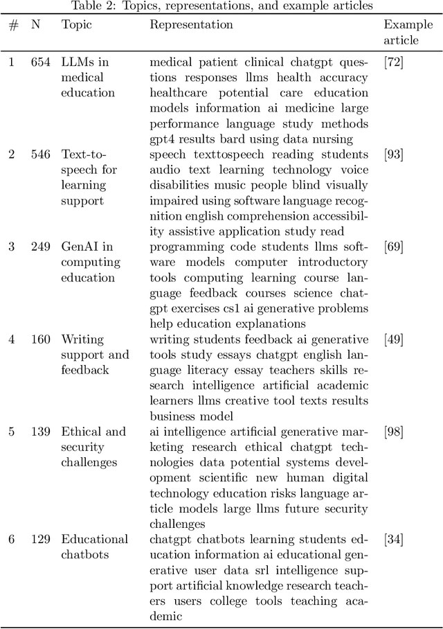 Abstract:Generative artificial intelligence (GenAI) can reshape education and learning. While large language models (LLMs) like ChatGPT dominate current educational research, multimodal capabilities, such as text-to-speech and text-to-image, are less explored. This study uses topic modeling to map the research landscape of multimodal and generative AI in education. An extensive literature search using Dimensions.ai yielded 4175 articles. Employing a topic modeling approach, latent topics were extracted, resulting in 38 interpretable topics organized into 14 thematic areas. Findings indicate a predominant focus on text-to-text models in educational contexts, with other modalities underexplored, overlooking the broader potential of multimodal approaches. The results suggest a research gap, stressing the importance of more balanced attention across different AI modalities and educational levels. In summary, this research provides an overview of current trends in generative AI for education, underlining opportunities for future exploration of multimodal technologies to fully realize the transformative potential of artificial intelligence in education.