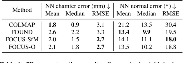 Abstract:Surface reconstruction from multiple, calibrated images is a challenging task - often requiring a large number of collected images with significant overlap. We look at the specific case of human foot reconstruction. As with previous successful foot reconstruction work, we seek to extract rich per-pixel geometry cues from multi-view RGB images, and fuse these into a final 3D object. Our method, FOCUS, tackles this problem with 3 main contributions: (i) SynFoot2, an extension of an existing synthetic foot dataset to include a new data type: dense correspondence with the parameterized foot model FIND; (ii) an uncertainty-aware dense correspondence predictor trained on our synthetic dataset; (iii) two methods for reconstructing a 3D surface from dense correspondence predictions: one inspired by Structure-from-Motion, and one optimization-based using the FIND model. We show that our reconstruction achieves state-of-the-art reconstruction quality in a few-view setting, performing comparably to state-of-the-art when many views are available, and runs substantially faster. We release our synthetic dataset to the research community. Code is available at: https://github.com/OllieBoyne/FOCUS