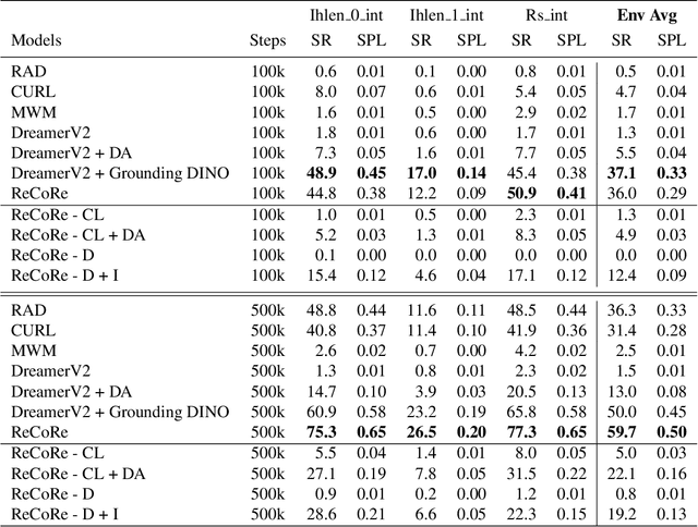 Abstract:While recent model-free Reinforcement Learning (RL) methods have demonstrated human-level effectiveness in gaming environments, their success in everyday tasks like visual navigation has been limited, particularly under significant appearance variations. This limitation arises from (i) poor sample efficiency and (ii) over-fitting to training scenarios. To address these challenges, we present a world model that learns invariant features using (i) contrastive unsupervised learning and (ii) an intervention-invariant regularizer. Learning an explicit representation of the world dynamics i.e. a world model, improves sample efficiency while contrastive learning implicitly enforces learning of invariant features, which improves generalization. However, the naive integration of contrastive loss to world models fails due to a lack of supervisory signals to the visual encoder, as world-model-based RL methods independently optimize representation learning and agent policy. To overcome this issue, we propose an intervention-invariant regularizer in the form of an auxiliary task such as depth prediction, image denoising, etc., that explicitly enforces invariance to style-interventions. Our method outperforms current state-of-the-art model-based and model-free RL methods and significantly on out-of-distribution point navigation task evaluated on the iGibson benchmark. We further demonstrate that our approach, with only visual observations, outperforms recent language-guided foundation models for point navigation, which is essential for deployment on robots with limited computation capabilities. Finally, we demonstrate that our proposed model excels at the sim-to-real transfer of its perception module on Gibson benchmark.
