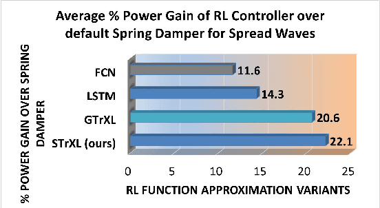 Abstract:The industrial multi-generator Wave Energy Converters (WEC) must handle multiple simultaneous waves coming from different directions called spread waves. These complex devices in challenging circumstances need controllers with multiple objectives of energy capture efficiency, reduction of structural stress to limit maintenance, and proactive protection against high waves. The Multi-Agent Reinforcement Learning (MARL) controller trained with the Proximal Policy Optimization (PPO) algorithm can handle these complexities. In this paper, we explore different function approximations for the policy and critic networks in modeling the sequential nature of the system dynamics and find that they are key to better performance. We investigated the performance of a fully connected neural network (FCN), LSTM, and Transformer model variants with varying depths and gated residual connections. Our results show that the transformer model of moderate depth with gated residual connections around the multi-head attention, multi-layer perceptron, and the transformer block (STrXL) proposed in this paper is optimal and boosts energy efficiency by an average of 22.1% for these complex spread waves over the existing spring damper (SD) controller. Furthermore, unlike the default SD controller, the transformer controller almost eliminated the mechanical stress from the rotational yaw motion for angled waves. Demo: https://tinyurl.com/yueda3jh