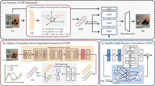 Abstract:The problem of blind image super-resolution aims to recover high-resolution (HR) images from low-resolution (LR) images with unknown degradation modes. Most existing methods model the image degradation process using blur kernels. However, this explicit modeling approach struggles to cover the complex and varied degradation processes encountered in the real world, such as high-order combinations of JPEG compression, blur, and noise. Implicit modeling for the degradation process can effectively overcome this issue, but a key challenge of implicit modeling is the lack of accurate ground truth labels for the degradation process to conduct supervised training. To overcome this limitations inherent in implicit modeling, we propose an \textbf{U}ncertainty-based degradation representation for blind \textbf{S}uper-\textbf{R}esolution framework (\textbf{USR}). By suppressing the uncertainty of local degradation representations in images, USR facilitated self-supervised learning of degradation representations. The USR consists of two components: Adaptive Uncertainty-Aware Degradation Extraction (AUDE) and a feature extraction network composed of Variable Depth Dynamic Convolution (VDDC) blocks. To extract Uncertainty-based Degradation Representation from LR images, the AUDE utilizes the Self-supervised Uncertainty Contrast module with Uncertainty Suppression Loss to suppress the inherent model uncertainty of the Degradation Extractor. Furthermore, VDDC block integrates degradation information through dynamic convolution. Rhe VDDC also employs an Adaptive Intensity Scaling operation that adaptively adjusts the degradation representation according to the network hierarchy, thereby facilitating the effective integration of degradation information. Quantitative and qualitative experiments affirm the superiority of our approach.