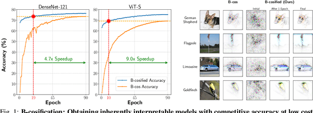 Abstract:B-cos Networks have been shown to be effective for obtaining highly human interpretable explanations of model decisions by architecturally enforcing stronger alignment between inputs and weight. B-cos variants of convolutional networks (CNNs) and vision transformers (ViTs), which primarily replace linear layers with B-cos transformations, perform competitively to their respective standard variants while also yielding explanations that are faithful by design. However, it has so far been necessary to train these models from scratch, which is increasingly infeasible in the era of large, pre-trained foundation models. In this work, inspired by the architectural similarities in standard DNNs and B-cos networks, we propose 'B-cosification', a novel approach to transform existing pre-trained models to become inherently interpretable. We perform a thorough study of design choices to perform this conversion, both for convolutional neural networks and vision transformers. We find that B-cosification can yield models that are on par with B-cos models trained from scratch in terms of interpretability, while often outperforming them in terms of classification performance at a fraction of the training cost. Subsequently, we apply B-cosification to a pretrained CLIP model, and show that, even with limited data and compute cost, we obtain a B-cosified version that is highly interpretable and competitive on zero shot performance across a variety of datasets. We release our code and pre-trained model weights at https://github.com/shrebox/B-cosification.