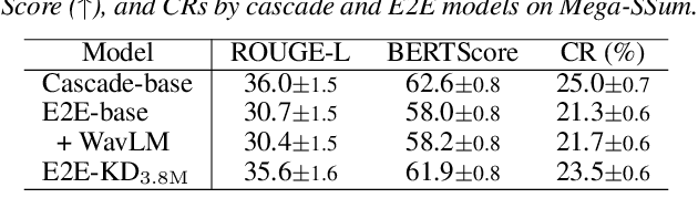 Abstract:This paper introduces a novel approach called sentence-wise speech summarization (Sen-SSum), which generates text summaries from a spoken document in a sentence-by-sentence manner. Sen-SSum combines the real-time processing of automatic speech recognition (ASR) with the conciseness of speech summarization. To explore this approach, we present two datasets for Sen-SSum: Mega-SSum and CSJ-SSum. Using these datasets, our study evaluates two types of Transformer-based models: 1) cascade models that combine ASR and strong text summarization models, and 2) end-to-end (E2E) models that directly convert speech into a text summary. While E2E models are appealing to develop compute-efficient models, they perform worse than cascade models. Therefore, we propose knowledge distillation for E2E models using pseudo-summaries generated by the cascade models. Our experiments show that this proposed knowledge distillation effectively improves the performance of the E2E model on both datasets.