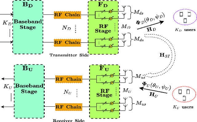 Abstract:This study employs a uniform rectangular array (URA) sub-connected hybrid beamforming (SC-HBF) architecture to provide a novel self-interference (SI) suppression scheme in a full-duplex (FD) massive multiple-input multiple-output (mMIMO) system. Our primary objective is to mitigate the strong SI through the design of RF beamforming stages for uplink and downlink transmissions that utilize the spatial degrees of freedom provided due to the use of large array structures. We propose a non-constant modulus RF beamforming (NCM-BF-SIS) scheme that incorporates the gain controllers for both transmit (Tx) and receive (Rx) RF beamforming stages and optimizes the uplink and downlink beam directions jointly with gain controller coefficients. To solve this challenging non-convex optimization problem, we propose a swarm intelligence-based algorithmic solution that finds the optimal beam perturbations while also adjusting the Tx/Rx gain controllers to alleviate SI subject to the directivity degradation constraints for the beams. The data-driven analysis based on the measured SI channel in an anechoic chamber shows that the proposed NCM-BF-SIS scheme can suppress SI by around 80 dB in FD mMIMO systems.