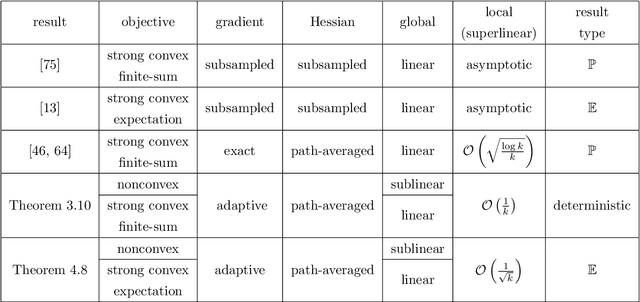 Abstract:We consider minimizing finite-sum and expectation objective functions via Hessian-averaging based subsampled Newton methods. These methods allow for gradient inexactness and have fixed per-iteration Hessian approximation costs. The recent work (Na et al. 2023) demonstrated that Hessian averaging can be utilized to achieve fast $\mathcal{O}\left(\sqrt{\tfrac{\log k}{k}}\right)$ local superlinear convergence for strongly convex functions in high probability, while maintaining fixed per-iteration Hessian costs. These methods, however, require gradient exactness and strong convexity, which poses challenges for their practical implementation. To address this concern we consider Hessian-averaged methods that allow gradient inexactness via norm condition based adaptive-sampling strategies. For the finite-sum problem we utilize deterministic sampling techniques which lead to global linear and sublinear convergence rates for strongly convex and nonconvex functions respectively. In this setting we are able to derive an improved deterministic local superlinear convergence rate of $\mathcal{O}\left(\tfrac{1}{k}\right)$. For the %expected risk expectation problem we utilize stochastic sampling techniques, and derive global linear and sublinear rates for strongly convex and nonconvex functions, as well as a $\mathcal{O}\left(\tfrac{1}{\sqrt{k}}\right)$ local superlinear convergence rate, all in expectation. We present novel analysis techniques that differ from the previous probabilistic results. Additionally, we propose scalable and efficient variations of these methods via diagonal approximations and derive the novel diagonally-averaged Newton (Dan) method for large-scale problems. Our numerical results demonstrate that the Hessian averaging not only helps with convergence, but can lead to state-of-the-art performance on difficult problems such as CIFAR100 classification with ResNets.