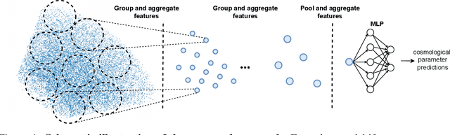 Abstract:In recent years, deep learning approaches have achieved state-of-the-art results in the analysis of point cloud data. In cosmology, galaxy redshift surveys resemble such a permutation invariant collection of positions in space. These surveys have so far mostly been analysed with two-point statistics, such as power spectra and correlation functions. The usage of these summary statistics is best justified on large scales, where the density field is linear and Gaussian. However, in light of the increased precision expected from upcoming surveys, the analysis of -- intrinsically non-Gaussian -- small angular separations represents an appealing avenue to better constrain cosmological parameters. In this work, we aim to improve upon two-point statistics by employing a \textit{PointNet}-like neural network to regress the values of the cosmological parameters directly from point cloud data. Our implementation of PointNets can analyse inputs of $\mathcal{O}(10^4) - \mathcal{O}(10^5)$ galaxies at a time, which improves upon earlier work for this application by roughly two orders of magnitude. Additionally, we demonstrate the ability to analyse galaxy redshift survey data on the lightcone, as opposed to previously static simulation boxes at a given fixed redshift.