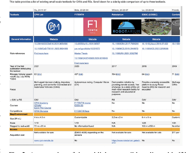Abstract:Connected and automated vehicles and robot swarms hold transformative potential for enhancing safety, efficiency, and sustainability in the transportation and manufacturing sectors. Extensive testing and validation of these technologies is crucial for their deployment in the real world. While simulations are essential for initial testing, they often have limitations in capturing the complex dynamics of real-world interactions. This limitation underscores the importance of small-scale testbeds. These testbeds provide a realistic, cost-effective, and controlled environment for testing and validating algorithms, acting as an essential intermediary between simulation and full-scale experiments. This work serves to facilitate researchers' efforts in identifying existing small-scale testbeds suitable for their experiments and provide insights for those who want to build their own. In addition, it delivers a comprehensive survey of the current landscape of these testbeds. We derive 62 characteristics of testbeds based on the well-known sense-plan-act paradigm and offer an online table comparing 22 small-scale testbeds based on these characteristics. The online table is hosted on our designated public webpage www.cpm-remote.de/testbeds, and we invite testbed creators and developers to contribute to it. We closely examine nine testbeds in this paper, demonstrating how the derived characteristics can be used to present testbeds. Furthermore, we discuss three ongoing challenges concerning small-scale testbeds that we identified, i.e., small-scale to full-scale transition, sustainability, and power and resource management.
