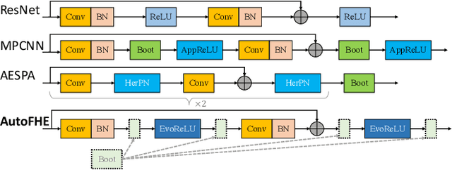 Abstract:Secure inference of deep convolutional neural networks (CNNs) under RNS-CKKS involves polynomial approximation of unsupported non-linear activation functions. However, existing approaches have three main limitations: 1) Inflexibility: The polynomial approximation and associated homomorphic evaluation architecture are customized manually for each CNN architecture and do not generalize to other networks. 2) Suboptimal Approximation: Each activation function is approximated instead of the function represented by the CNN. 3) Restricted Design: Either high-degree or low-degree polynomial approximations are used. The former retains high accuracy but slows down inference due to bootstrapping operations, while the latter accelerates ciphertext inference but compromises accuracy. To address these limitations, we present AutoFHE, which automatically adapts standard CNNs for secure inference under RNS-CKKS. The key idea is to adopt layerwise mixed-degree polynomial activation functions, which are optimized jointly with the homomorphic evaluation architecture in terms of the placement of bootstrapping operations. The problem is modeled within a multi-objective optimization framework to maximize accuracy and minimize the number of bootstrapping operations. AutoFHE can be applied flexibly on any CNN architecture, and it provides diverse solutions that span the trade-off between accuracy and latency. Experimental evaluation over RNS-CKKS encrypted CIFAR datasets shows that AutoFHE accelerates secure inference by $1.32\times$ to $1.8\times$ compared to methods employing high-degree polynomials. It also improves accuracy by up to 2.56% compared to methods using low-degree polynomials. Lastly, AutoFHE accelerates inference and improves accuracy by $103\times$ and 3.46%, respectively, compared to CNNs under TFHE.