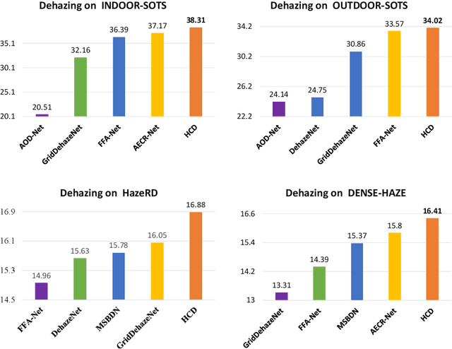 Abstract:Image restoration under hazy weather condition, which is called single image dehazing, has been of significant interest for various computer vision applications. In recent years, deep learning-based methods have achieved success. However, existing image dehazing methods typically neglect the hierarchy of features in the neural network and fail to exploit their relationships fully. To this end, we propose an effective image dehazing method named Hierarchical Contrastive Dehazing (HCD), which is based on feature fusion and contrastive learning strategies. HCD consists of a hierarchical dehazing network (HDN) and a novel hierarchical contrastive loss (HCL). Specifically, the core design in the HDN is a Hierarchical Interaction Module, which utilizes multi-scale activation to revise the feature responses hierarchically. To cooperate with the training of HDN, we propose HCL which performs contrastive learning on hierarchically paired exemplars, facilitating haze removal. Extensive experiments on public datasets, RESIDE, HazeRD, and DENSE-HAZE, demonstrate that HCD quantitatively outperforms the state-of-the-art methods in terms of PSNR, SSIM and achieves better visual quality.