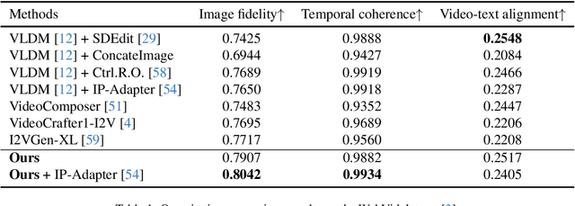 Abstract:Image-to-video (I2V) generation tasks always suffer from keeping high fidelity in the open domains. Traditional image animation techniques primarily focus on specific domains such as faces or human poses, making them difficult to generalize to open domains. Several recent I2V frameworks based on diffusion models can generate dynamic content for open domain images but fail to maintain fidelity. We found that two main factors of low fidelity are the loss of image details and the noise prediction biases during the denoising process. To this end, we propose an effective method that can be applied to mainstream video diffusion models. This method achieves high fidelity based on supplementing more precise image information and noise rectification. Specifically, given a specified image, our method first adds noise to the input image latent to keep more details, then denoises the noisy latent with proper rectification to alleviate the noise prediction biases. Our method is tuning-free and plug-and-play. The experimental results demonstrate the effectiveness of our approach in improving the fidelity of generated videos. For more image-to-video generated results, please refer to the project website: https://noise-rectification.github.io.