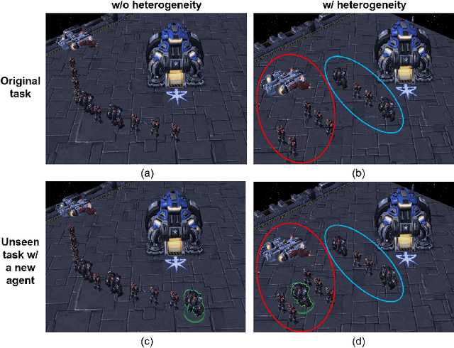 Abstract:The rise of multi-agent systems, especially the success of multi-agent reinforcement learning (MARL), is reshaping our future across diverse domains like autonomous vehicle networks. However, MARL still faces significant challenges, particularly in achieving zero-shot scalability, which allows trained MARL models to be directly applied to unseen tasks with varying numbers of agents. In addition, real-world multi-agent systems usually contain agents with different functions and strategies, while the existing scalable MARL methods only have limited heterogeneity. To address this, we propose a novel MARL framework named Scalable and Heterogeneous Proximal Policy Optimization (SHPPO), integrating heterogeneity into parameter-shared PPO-based MARL networks. we first leverage a latent network to adaptively learn strategy patterns for each agent. Second, we introduce a heterogeneous layer for decision-making, whose parameters are specifically generated by the learned latent variables. Our approach is scalable as all the parameters are shared except for the heterogeneous layer, and gains both inter-individual and temporal heterogeneity at the same time. We implement our approach based on the state-of-the-art backbone PPO-based algorithm as SHPPO, while our approach is agnostic to the backbone and can be seamlessly plugged into any parameter-shared MARL method. SHPPO exhibits superior performance over the baselines such as MAPPO and HAPPO in classic MARL environments like Starcraft Multi-Agent Challenge (SMAC) and Google Research Football (GRF), showcasing enhanced zero-shot scalability and offering insights into the learned latent representation's impact on team performance by visualization.