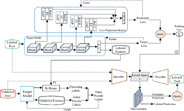 Abstract:Active learning aims to alleviate the amount of labor involved in data labeling by automating the selection of unlabeled samples via an acquisition function. For example, variational adversarial active learning (VAAL) leverages an adversarial network to discriminate unlabeled samples from labeled ones using latent space information. However, VAAL has the following shortcomings: (i) it does not exploit target task information, and (ii) unlabeled data is only used for sample selection rather than model training. To address these limitations, we introduce novel techniques that significantly improve the use of abundant unlabeled data during training and take into account the task information. Concretely, we propose an improved pseudo-labeling algorithm that leverages information from all unlabeled data in a semi-supervised manner, thus allowing a model to explore a richer data space. In addition, we develop a ranking-based loss prediction module that converts predicted relative ranking information into a differentiable ranking loss. This loss can be embedded as a rank variable into the latent space of a variational autoencoder and then trained with a discriminator in an adversarial fashion for sample selection. We demonstrate the superior performance of our approach over the state of the art on various image classification and segmentation benchmark datasets.