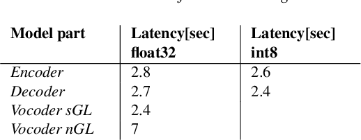 Abstract:We present a fully on-device and streaming Speech-To-Speech (STS) conversion model that normalizes a given input speech directly to synthesized output speech (a.k.a. Parrotron). Deploying such an end-to-end model locally on mobile devices pose significant challenges in terms of memory footprint and computation requirements. In this paper, we present a streaming-based approach to produce an acceptable delay, with minimal loss in speech conversion quality, when compared to a non-streaming server-based approach. Our approach consists of first streaming the encoder in real time while the speaker is speaking. Then, as soon as the speaker stops speaking, we run the spectrogram decoder in streaming mode along the side of a streaming vocoder to generate output speech in real time. To achieve an acceptable delay quality trade-off, we study a novel hybrid approach for look-ahead in the encoder which combines a look-ahead feature stacker with a look-ahead self-attention. We also compare the model with int4 quantization aware training and int8 post training quantization and show that our streaming approach is 2x faster than real time on the Pixel4 CPU.