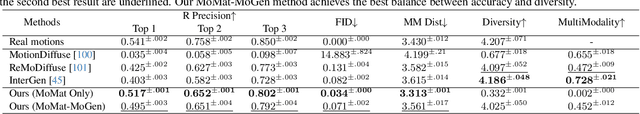Abstract:3D human motion generation is crucial for creative industry. Recent advances rely on generative models with domain knowledge for text-driven motion generation, leading to substantial progress in capturing common motions. However, the performance on more diverse motions remains unsatisfactory. In this work, we propose ReMoDiffuse, a diffusion-model-based motion generation framework that integrates a retrieval mechanism to refine the denoising process. ReMoDiffuse enhances the generalizability and diversity of text-driven motion generation with three key designs: 1) Hybrid Retrieval finds appropriate references from the database in terms of both semantic and kinematic similarities. 2) Semantic-Modulated Transformer selectively absorbs retrieval knowledge, adapting to the difference between retrieved samples and the target motion sequence. 3) Condition Mixture better utilizes the retrieval database during inference, overcoming the scale sensitivity in classifier-free guidance. Extensive experiments demonstrate that ReMoDiffuse outperforms state-of-the-art methods by balancing both text-motion consistency and motion quality, especially for more diverse motion generation.
