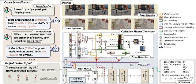 Abstract:Crowd Motion Generation is essential in entertainment industries such as animation and games as well as in strategic fields like urban simulation and planning. This new task requires an intricate integration of control and generation to realistically synthesize crowd dynamics under specific spatial and semantic constraints, whose challenges are yet to be fully explored. On the one hand, existing human motion generation models typically focus on individual behaviors, neglecting the complexities of collective behaviors. On the other hand, recent methods for multi-person motion generation depend heavily on pre-defined scenarios and are limited to a fixed, small number of inter-person interactions, thus hampering their practicality. To overcome these challenges, we introduce CrowdMoGen, a zero-shot text-driven framework that harnesses the power of Large Language Model (LLM) to incorporate the collective intelligence into the motion generation framework as guidance, thereby enabling generalizable planning and generation of crowd motions without paired training data. Our framework consists of two key components: 1) Crowd Scene Planner that learns to coordinate motions and dynamics according to specific scene contexts or introduced perturbations, and 2) Collective Motion Generator that efficiently synthesizes the required collective motions based on the holistic plans. Extensive quantitative and qualitative experiments have validated the effectiveness of our framework, which not only fills a critical gap by providing scalable and generalizable solutions for Crowd Motion Generation task but also achieves high levels of realism and flexibility.