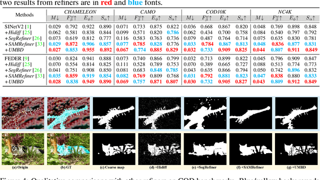 Abstract:Camouflaged Object Detection (COD) presents inherent challenges due to the subtle visual differences between targets and their backgrounds. While existing methods have made notable progress, there remains significant potential for post-processing refinement that has yet to be fully explored. To address this limitation, we propose the Uncertainty-Masked Bernoulli Diffusion (UMBD) model, the first generative refinement framework specifically designed for COD. UMBD introduces an uncertainty-guided masking mechanism that selectively applies Bernoulli diffusion to residual regions with poor segmentation quality, enabling targeted refinement while preserving correctly segmented areas. To support this process, we design the Hybrid Uncertainty Quantification Network (HUQNet), which employs a multi-branch architecture and fuses uncertainty from multiple sources to improve estimation accuracy. This enables adaptive guidance during the generative sampling process. The proposed UMBD framework can be seamlessly integrated with a wide range of existing Encoder-Decoder-based COD models, combining their discriminative capabilities with the generative advantages of diffusion-based refinement. Extensive experiments across multiple COD benchmarks demonstrate consistent performance improvements, achieving average gains of 5.5% in MAE and 3.2% in weighted F-measure with only modest computational overhead. Code will be released.