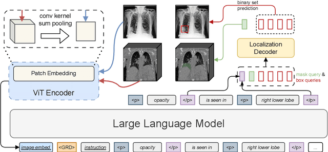 Abstract:Recent advancements in Vision Language Models (VLMs) have demonstrated remarkable promise in generating visually grounded responses. However, their application in the medical domain is hindered by unique challenges. For instance, most VLMs rely on a single method of visual grounding, whereas complex medical tasks demand more versatile approaches. Additionally, while most VLMs process only 2D images, a large portion of medical images are 3D. The lack of medical data further compounds these obstacles. To address these challenges, we present VividMed, a vision language model with versatile visual grounding for medicine. Our model supports generating both semantic segmentation masks and instance-level bounding boxes, and accommodates various imaging modalities, including both 2D and 3D data. We design a three-stage training procedure and an automatic data synthesis pipeline based on open datasets and models. Besides visual grounding tasks, VividMed also excels in other common downstream tasks, including Visual Question Answering (VQA) and report generation. Ablation studies empirically show that the integration of visual grounding ability leads to improved performance on these tasks. Our code is publicly available at https://github.com/function2-llx/MMMM.