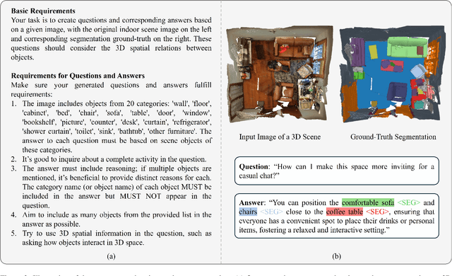 Abstract:The recent development in multimodal learning has greatly advanced the research in 3D scene understanding in various real-world tasks such as embodied AI. However, most existing work shares two typical constraints: 1) they are short of reasoning ability for interaction and interpretation of human intension and 2) they focus on scenarios with single-category objects only which leads to over-simplified textual descriptions due to the negligence of multi-object scenarios and spatial relations among objects. We bridge the research gaps by proposing a 3D reasoning segmentation task for multiple objects in scenes. The task allows producing 3D segmentation masks and detailed textual explanations as enriched by 3D spatial relations among objects. To this end, we create ReasonSeg3D, a large-scale and high-quality benchmark that integrates 3D spatial relations with generated question-answer pairs and 3D segmentation masks. In addition, we design MORE3D, a simple yet effective method that enables multi-object 3D reasoning segmentation with user questions and textual outputs. Extensive experiments show that MORE3D excels in reasoning and segmenting complex multi-object 3D scenes, and the created ReasonSeg3D offers a valuable platform for future exploration of 3D reasoning segmentation. The dataset and code will be released.