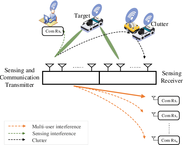 Abstract:The integrated sensing and communication (ISAC) system under multi-input multi-output (MIMO) architecture achieves dual functionalities of sensing and communication on the same platform by utilizing spatial gain, which provides a feasible paradigm facing spectrum congestion. However, the dual functionalities of sensing and communication operating simultaneously in the same platform bring severe interference in the ISAC systems. Facing this challenge, we propose a joint optimization framework for transmit beamforming and receive filter design for ISAC systems with MIMO architecture. We aim to maximize the signal-to-clutter-plus-noise ratio (SCNR) at the receiver while considering various constraints such as waveform similarity, power budget, and communication performance requirements to ensure the integration of the dual functionalities. In particular, the overall transmit beamforming is refined into sensing beamforming and communication beamforming, and a quadratic transformation (QT) is introduced to relax and convert the complex non-convex optimization objective. An efficient algorithm based on covariance matrix tapers (CMT) is proposed to restructure the clutter covariance matrix considering the mismatched steering vector, thereby improving the robustness of the ISAC transceiver design. Numerical simulations are provided to demonstrate the effectiveness of the proposed algorithm.