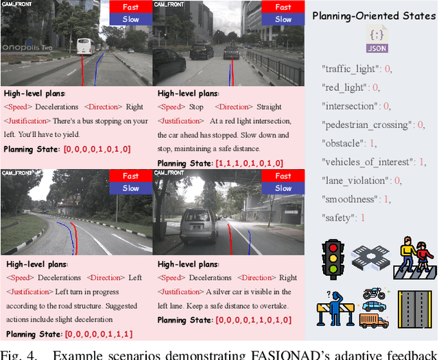 Abstract:Ensuring safe, comfortable, and efficient navigation is a critical goal for autonomous driving systems. While end-to-end models trained on large-scale datasets excel in common driving scenarios, they often struggle with rare, long-tail events. Recent progress in large language models (LLMs) has introduced enhanced reasoning capabilities, but their computational demands pose challenges for real-time decision-making and precise planning. This paper presents FASIONAD, a novel dual-system framework inspired by the cognitive model "Thinking, Fast and Slow." The fast system handles routine navigation tasks using rapid, data-driven path planning, while the slow system focuses on complex reasoning and decision-making in challenging or unfamiliar situations. A dynamic switching mechanism based on score distribution and feedback allows seamless transitions between the two systems. Visual prompts generated by the fast system enable human-like reasoning in the slow system, which provides high-quality feedback to enhance the fast system's decision-making. To evaluate FASIONAD, we introduce a new benchmark derived from the nuScenes dataset, specifically designed to differentiate fast and slow scenarios. FASIONAD achieves state-of-the-art performance on this benchmark, establishing a new standard for frameworks integrating fast and slow cognitive processes in autonomous driving. This approach paves the way for more adaptive, human-like autonomous driving systems.