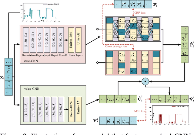 Abstract:Non-intrusive load monitoring (NILM) aims to decompose aggregated electrical usage signal into appliance-specific power consumption and it amounts to a classical example of blind source separation tasks. Leveraging recent progress on deep learning techniques, we design a new neural NILM model Multi-State Dual CNN (MSDC). Different from previous models, MSDC explicitly extracts information about the appliance's multiple states and state transitions, which in turn regulates the prediction of signals for appliances. More specifically, we employ a dual-CNN architecture: one CNN for outputting state distributions and the other for predicting the power of each state. A new technique is invented that utilizes conditional random fields (CRF) to capture state transitions. Experiments on two real-world datasets REDD and UK-DALE demonstrate that our model significantly outperform state-of-the-art models while having good generalization capacity, achieving 6%-10% MAE gain and 33%-51% SAE gain to unseen appliances.