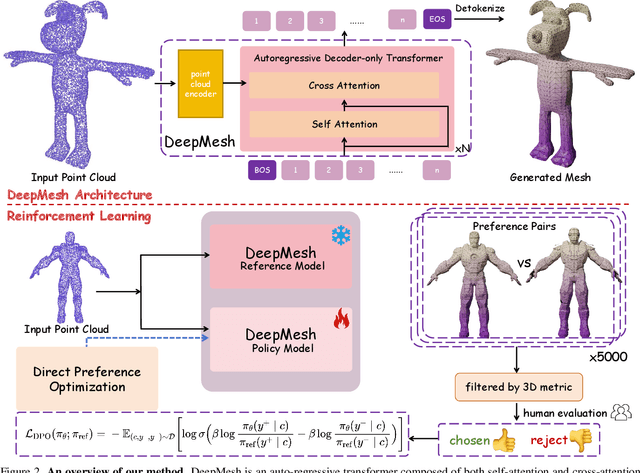 Abstract:Triangle meshes play a crucial role in 3D applications for efficient manipulation and rendering. While auto-regressive methods generate structured meshes by predicting discrete vertex tokens, they are often constrained by limited face counts and mesh incompleteness. To address these challenges, we propose DeepMesh, a framework that optimizes mesh generation through two key innovations: (1) an efficient pre-training strategy incorporating a novel tokenization algorithm, along with improvements in data curation and processing, and (2) the introduction of Reinforcement Learning (RL) into 3D mesh generation to achieve human preference alignment via Direct Preference Optimization (DPO). We design a scoring standard that combines human evaluation with 3D metrics to collect preference pairs for DPO, ensuring both visual appeal and geometric accuracy. Conditioned on point clouds and images, DeepMesh generates meshes with intricate details and precise topology, outperforming state-of-the-art methods in both precision and quality. Project page: https://zhaorw02.github.io/DeepMesh/
