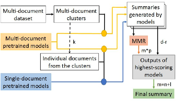 Abstract:Fine-tuning the Natural Language Processing (NLP) models for each new data set requires higher computational time associated with increased carbon footprint and cost. However, fine-tuning helps the pre-trained models adapt to the latest data sets; what if we avoid the fine-tuning steps and attempt to generate summaries using just the pre-trained models to reduce computational time and cost. In this paper, we tried to omit the fine-tuning steps and investigate whether the Marginal Maximum Relevance (MMR)-based approach can help the pre-trained models to obtain query-focused summaries directly from a new data set that was not used to pre-train the models. First, we used topic modelling on Wikipedia Current Events Portal (WCEP) and Debatepedia datasets to generate queries for summarization tasks. Then, using MMR, we ranked the sentences of the documents according to the queries. Next, we passed the ranked sentences to seven transformer-based pre-trained models to perform the summarization tasks. Finally, we used the MMR approach again to select the query relevant sentences from the generated summaries of individual pre-trained models and constructed the final summary. As indicated by the experimental results, our MMR-based approach successfully ranked and selected the most relevant sentences as summaries and showed better performance than the individual pre-trained models.