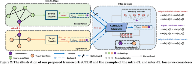 Abstract:Cross-domain recommendation (CDR) is a task that aims to improve the recommendation performance in a target domain by leveraging the information from source domains. Contrastive learning methods have been widely adopted among intra-domain (intra-CL) and inter-domain (inter-CL) users/items for their representation learning and knowledge transfer during the matching stage of CDR. However, we observe that directly employing contrastive learning on mixed-up intra-CL and inter-CL tasks ignores the difficulty of learning from inter-domain over learning from intra-domain, and thus could cause severe training instability. Therefore, this instability deteriorates the representation learning process and hurts the quality of generated embeddings. To this end, we propose a novel framework named SCCDR built up on a separated intra-CL and inter-CL paradigm and a stop-gradient operation to handle the drawback. Specifically, SCCDR comprises two specialized curriculum stages: intra-inter separation and inter-domain curriculum scheduling. The former stage explicitly uses two distinct contrastive views for the intra-CL task in the source and target domains, respectively. Meanwhile, the latter stage deliberately tackles the inter-CL tasks with a curriculum scheduling strategy that derives effective curricula by accounting for the difficulty of negative samples anchored by overlapping users. Empirical experiments on various open-source datasets and an offline proprietary industrial dataset extracted from a real-world recommender system, and an online A/B test verify that SCCDR achieves state-of-the-art performance over multiple baselines.