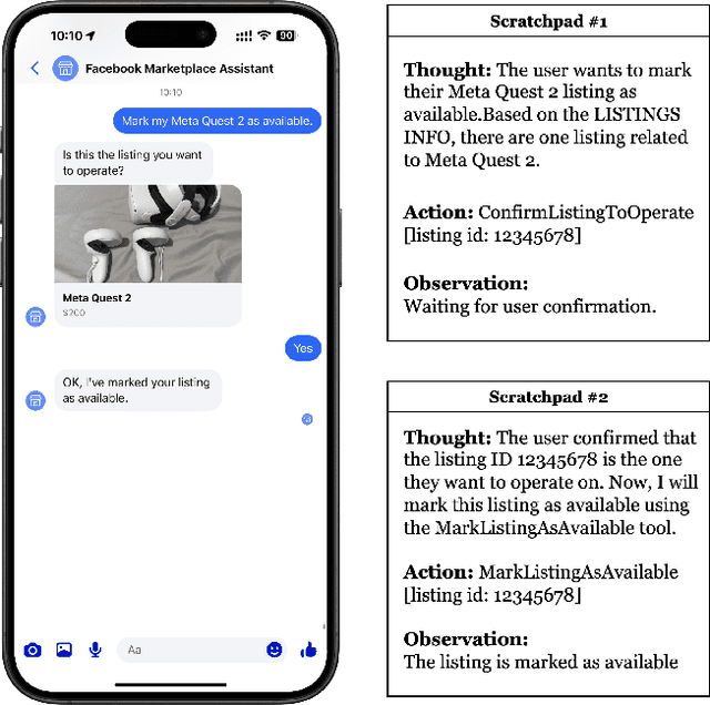 Abstract:The emergence of agentic AI, powered by Large Language Models (LLMs), marks a paradigm shift from reactive generative systems to proactive, goal-oriented autonomous agents capable of sophisticated planning, memory, and tool use. This evolution presents a novel opportunity to address long-standing challenges in complex digital environments. Core tasks on Consumer-to-Consumer (C2C) e-commerce platforms often require users to navigate complex Graphical User Interfaces (GUIs), making the experience time-consuming for both buyers and sellers. This paper introduces a novel approach to simplify these interactions through an LLM-powered agentic assistant. This agent functions as a new, conversational entry point to the marketplace, shifting the primary interaction model from a complex GUI to an intuitive AI agent. By interpreting natural language commands, the agent automates key high-friction workflows. For sellers, this includes simplified updating and renewal of listings, and the ability to send bulk messages. For buyers, the agent facilitates a more efficient product discovery process through conversational search. We present the architecture for Facebook Marketplace Assistant (FaMA), arguing that this agentic, conversational paradigm provides a lightweight and more accessible alternative to traditional app interfaces, allowing users to manage their marketplace activities with greater efficiency. Experiments show FaMA achieves a 98% task success rate on solving complex tasks on the marketplace and enables up to a 2x speedup on interaction time.